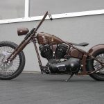 Die ungewöhnliche Tankform unterstreicht den geduckten look der HotRock! Der Rahmen wird unter dem Sattel zum Multifunktionsteil. Der Beherbergt den Öltank und die gesamte Elektrik incl. der Zündspule und Zündschloss. Der Heckfender mit integriertem Rücklicht ist eins mit der Schwinge. Und aus dieser entspringt der Kennzeichenhalter, der zum Radwechsel abgenommen werden kann. Den Racer Lenker für Springergabeln hat Udo beim Bau derr «Drag N» entwickelt. Er unterstreicht auch hier an der HotRock die Linie des Bikes zu 100%. Auch der Scheinwerfer mit integriertem Tacho ist in dieser Zeit entstanden. Nicht neu erfunden, aber in der Custom Szene neu interpretiert. Auch die Auspuffanlage und alle Kleinteile sind in Handarbeit entstanden. Die TTS Big Spoke Räder passen perfekt zur HotRock.