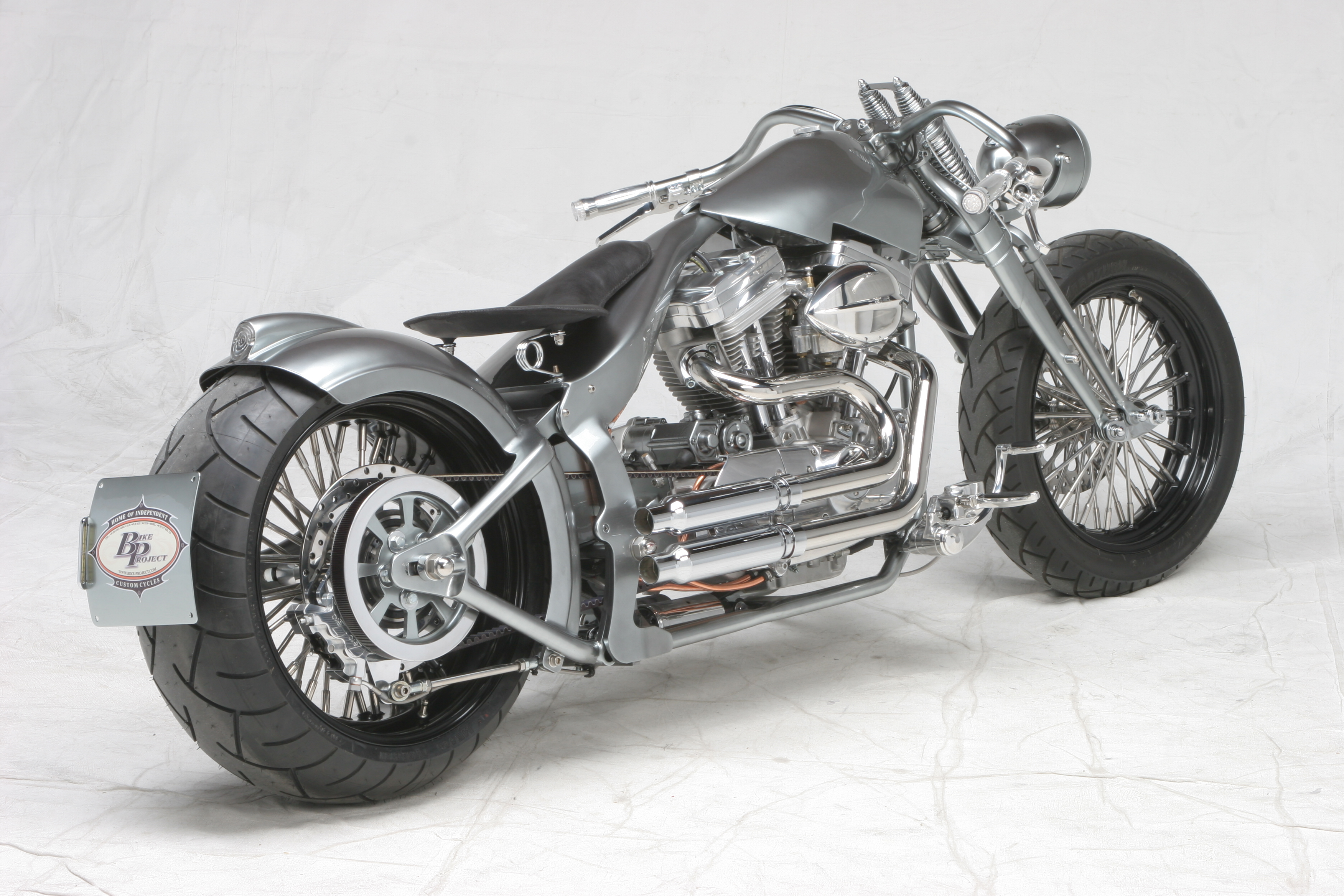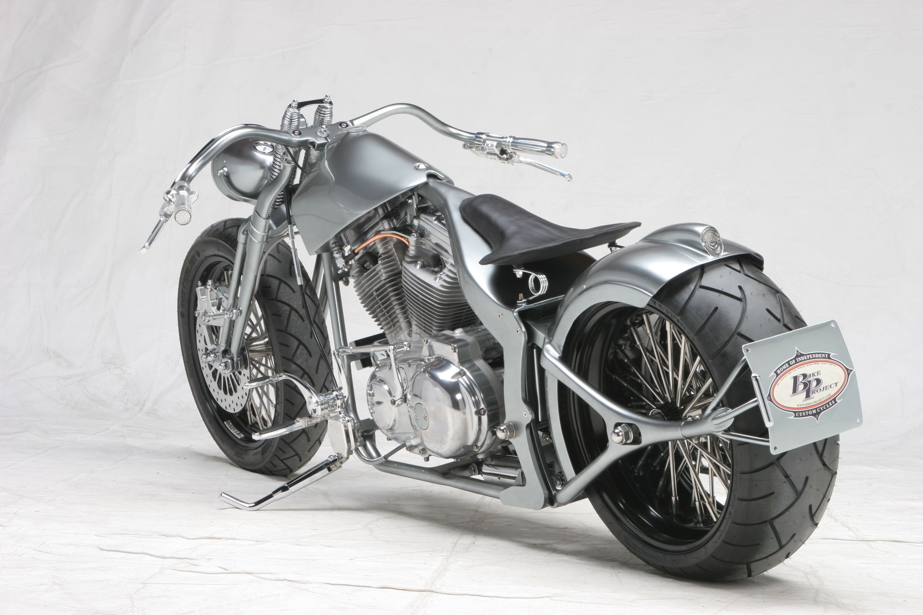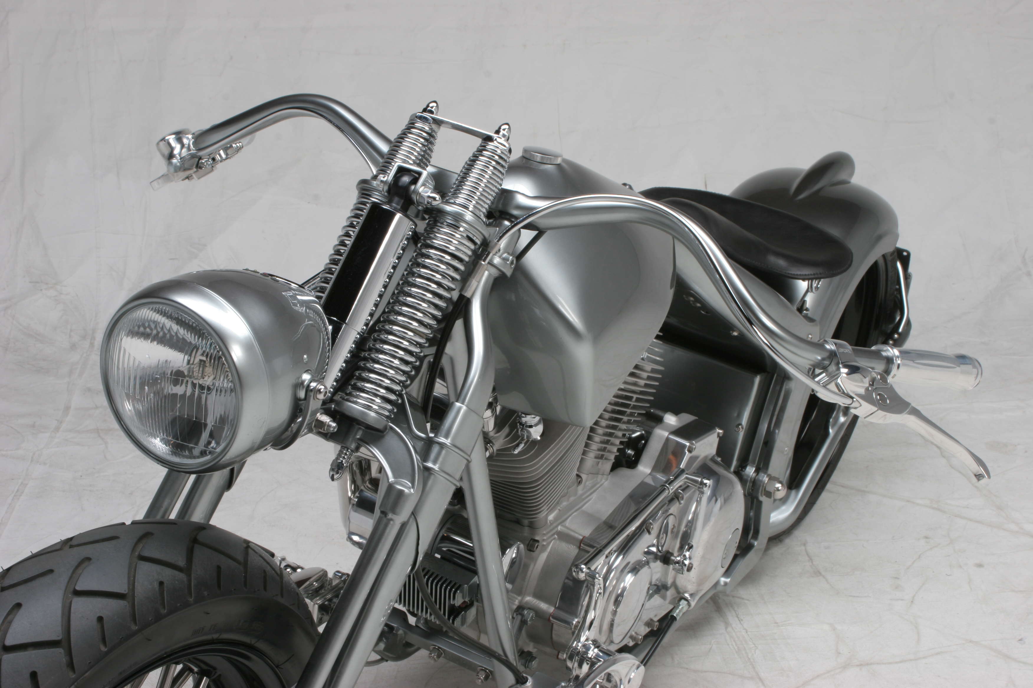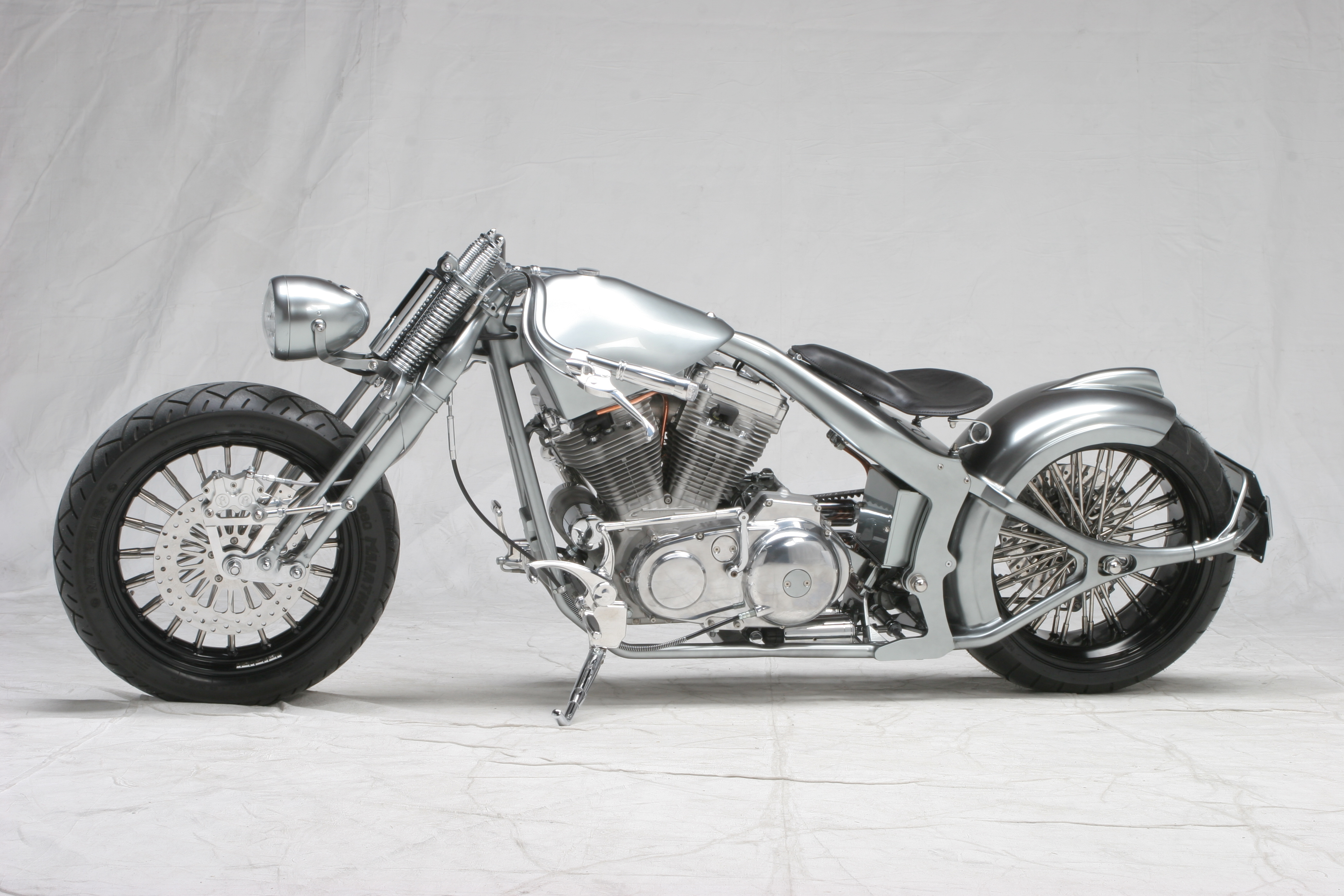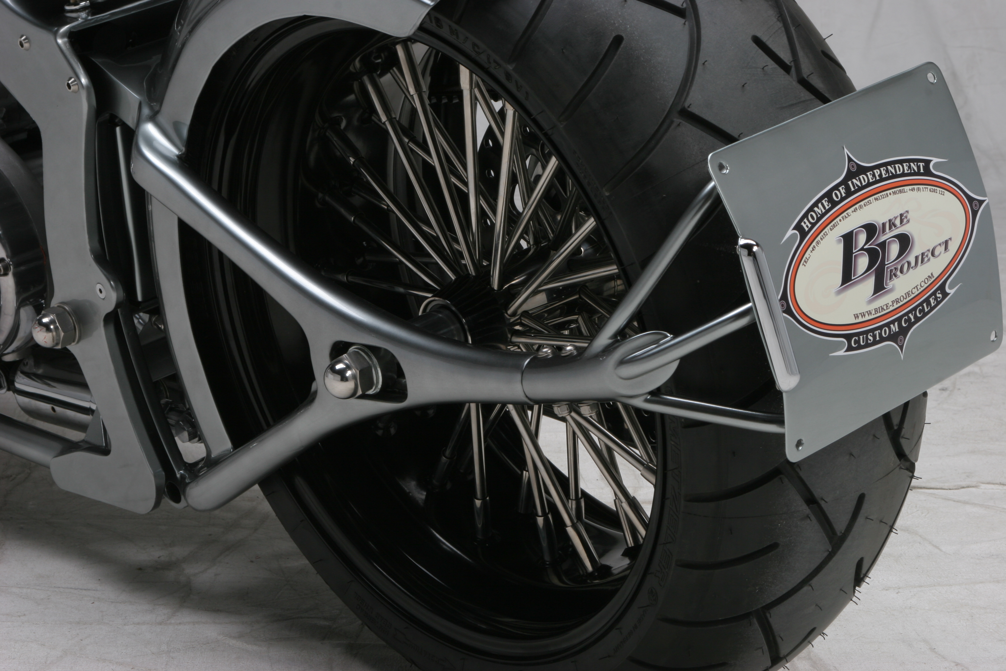 Die ungewöhnliche Tankform unterstreicht den geduckten look der HotRock! Der Rahmen wird unter dem Sattel zum Multifunktionsteil. Der Beherbergt den Öltank und die gesamte Elektrik incl. der Zündspule und Zündschloss. Der Heckfender mit integriertem Rücklicht ist eins mit der Schwinge. Und aus dieser entspringt der Kennzeichenhalter, der zum Radwechsel abgenommen werden kann. Den Racer Lenker für Springergabeln hat Udo beim Bau derr «Drag N» entwickelt. Er unterstreicht auch hier an der HotRock die Linie des Bikes zu 100%. Auch der Scheinwerfer mit integriertem Tacho ist in dieser Zeit entstanden. Nicht neu erfunden, aber in der Custom Szene neu interpretiert. Auch die Auspuffanlage und alle Kleinteile sind in Handarbeit entstanden. Die TTS Big Spoke Räder passen perfekt zur HotRock.
