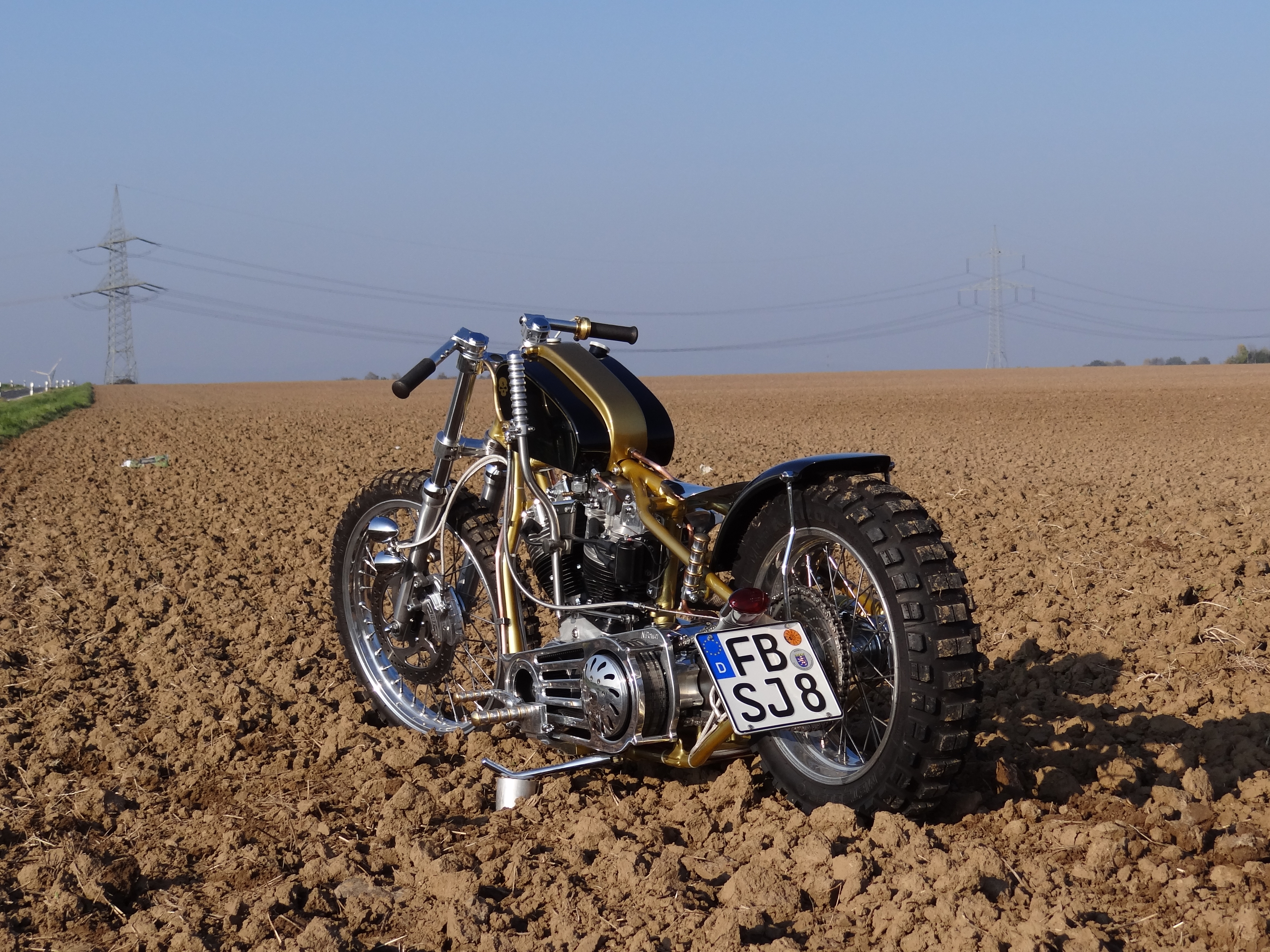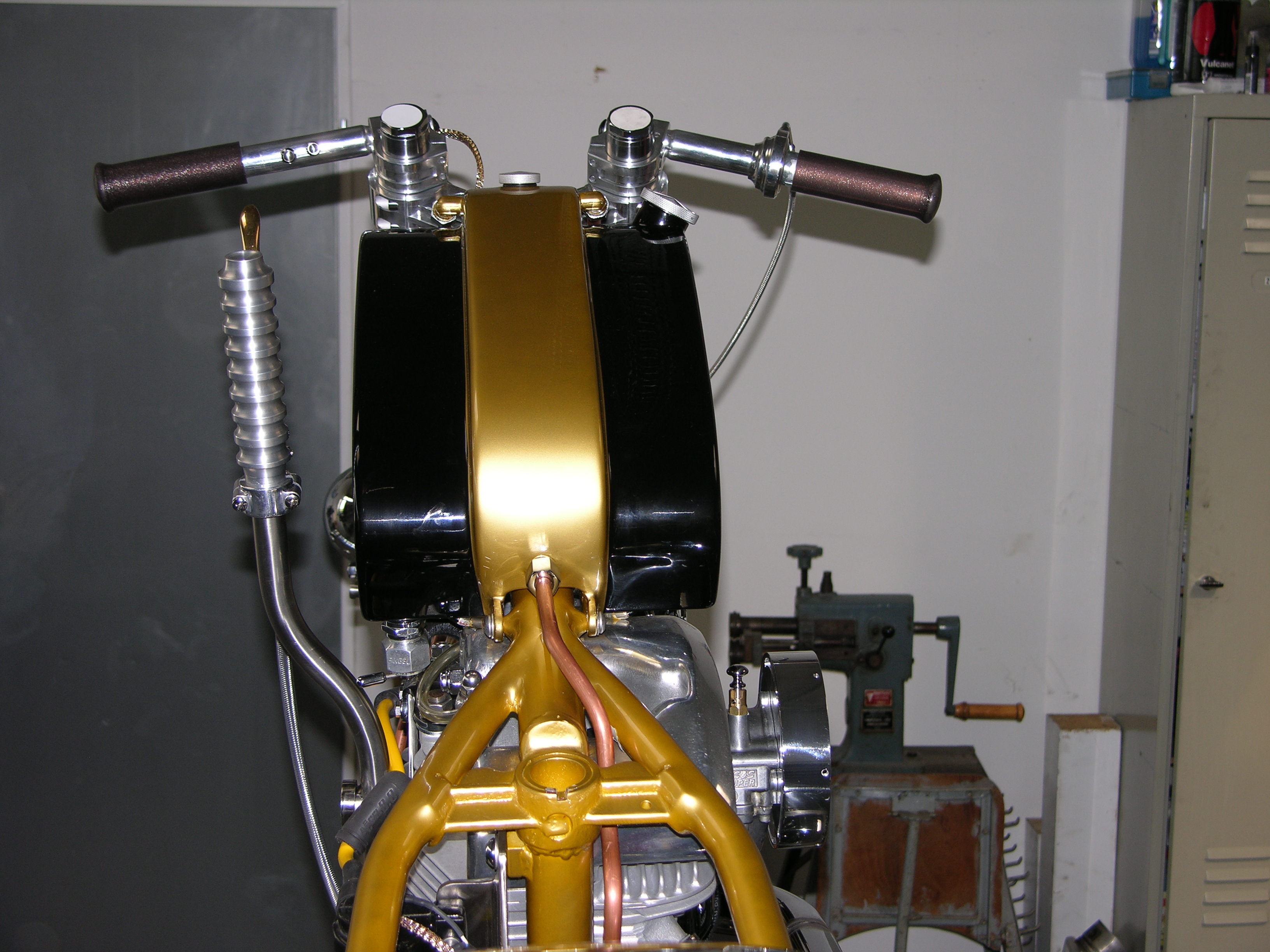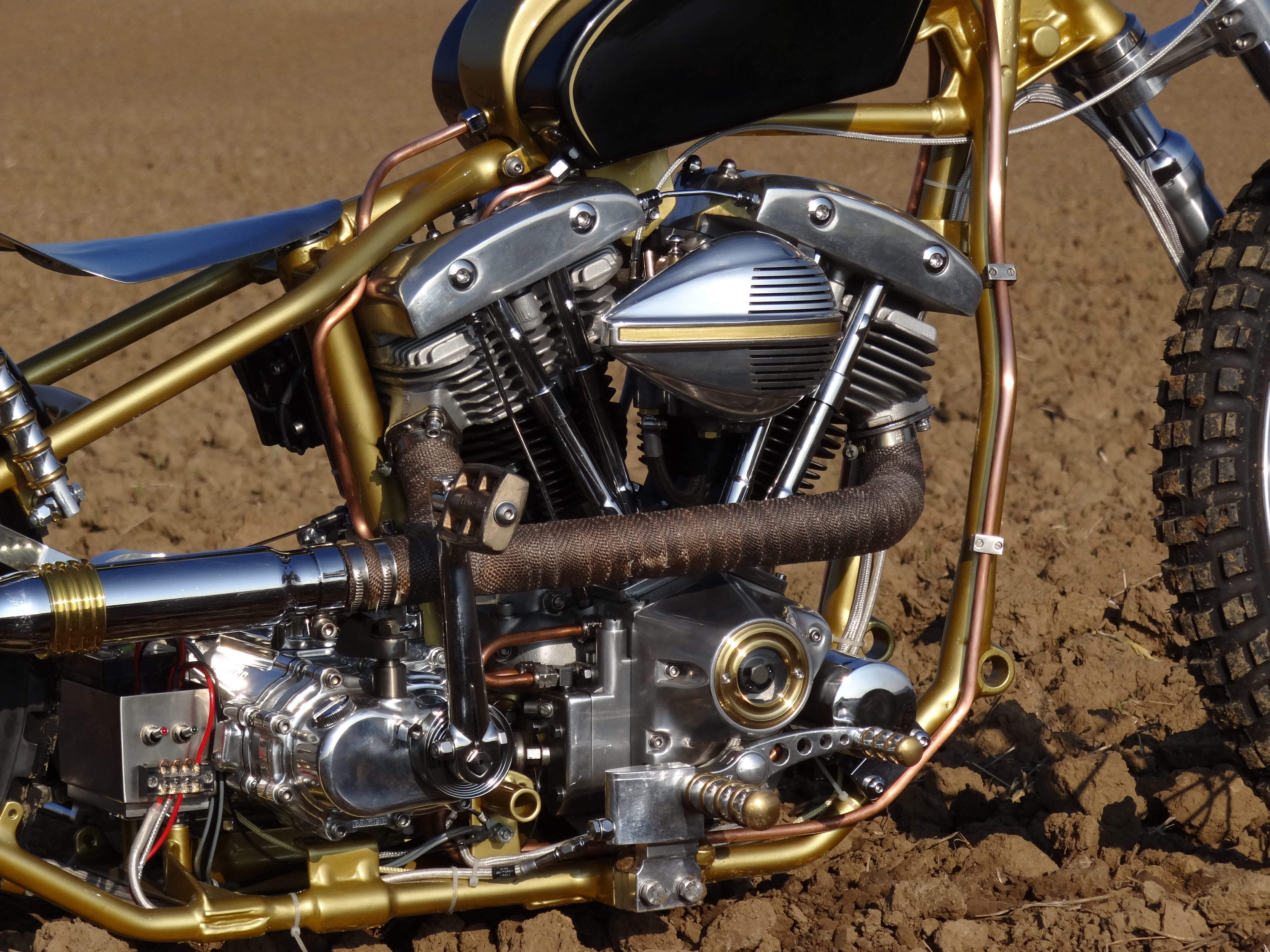 An dieser Harley-Davidson Shovel im Starrahmen hat Udo diverse Teile wie den Tank/Öltank Kombibehälter, die Starren Kupferleitungen, Krümmeranlage … angefertigt.