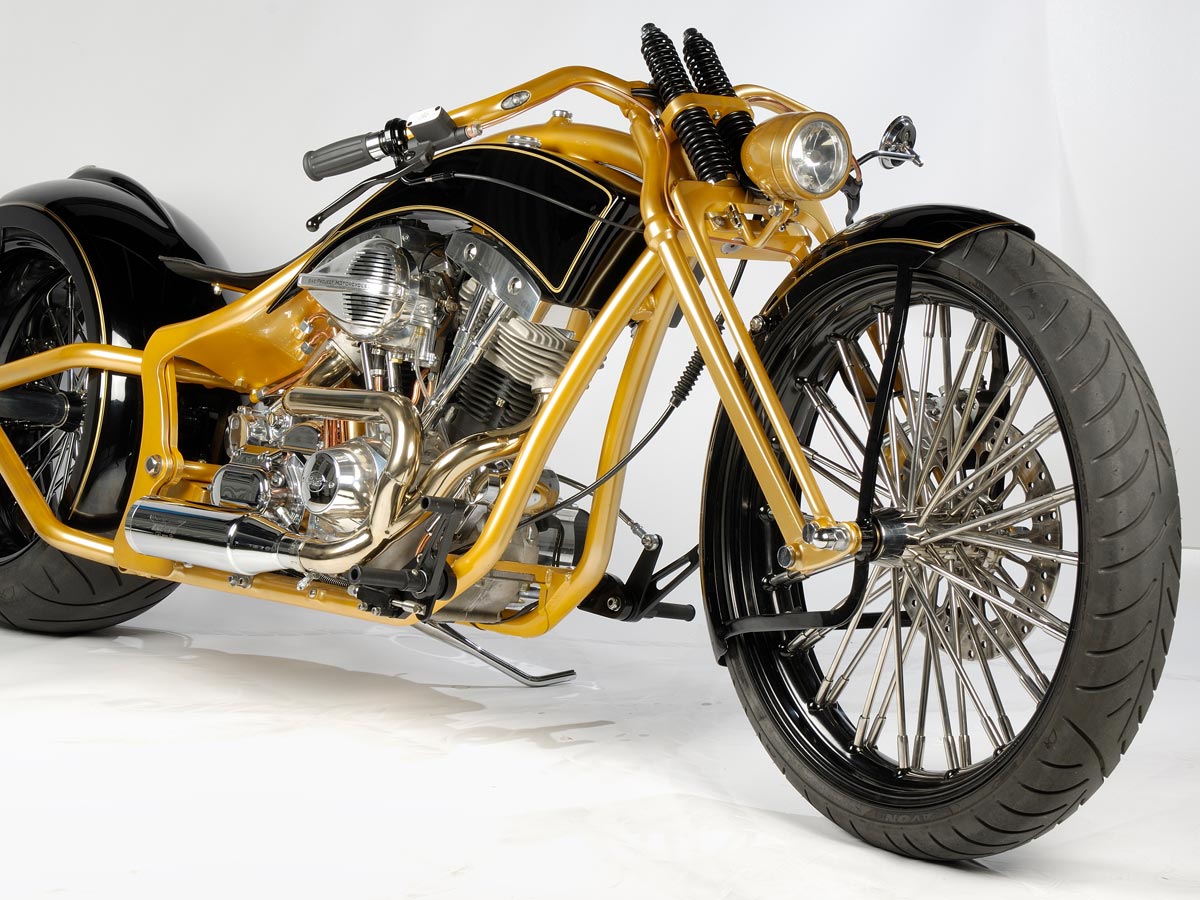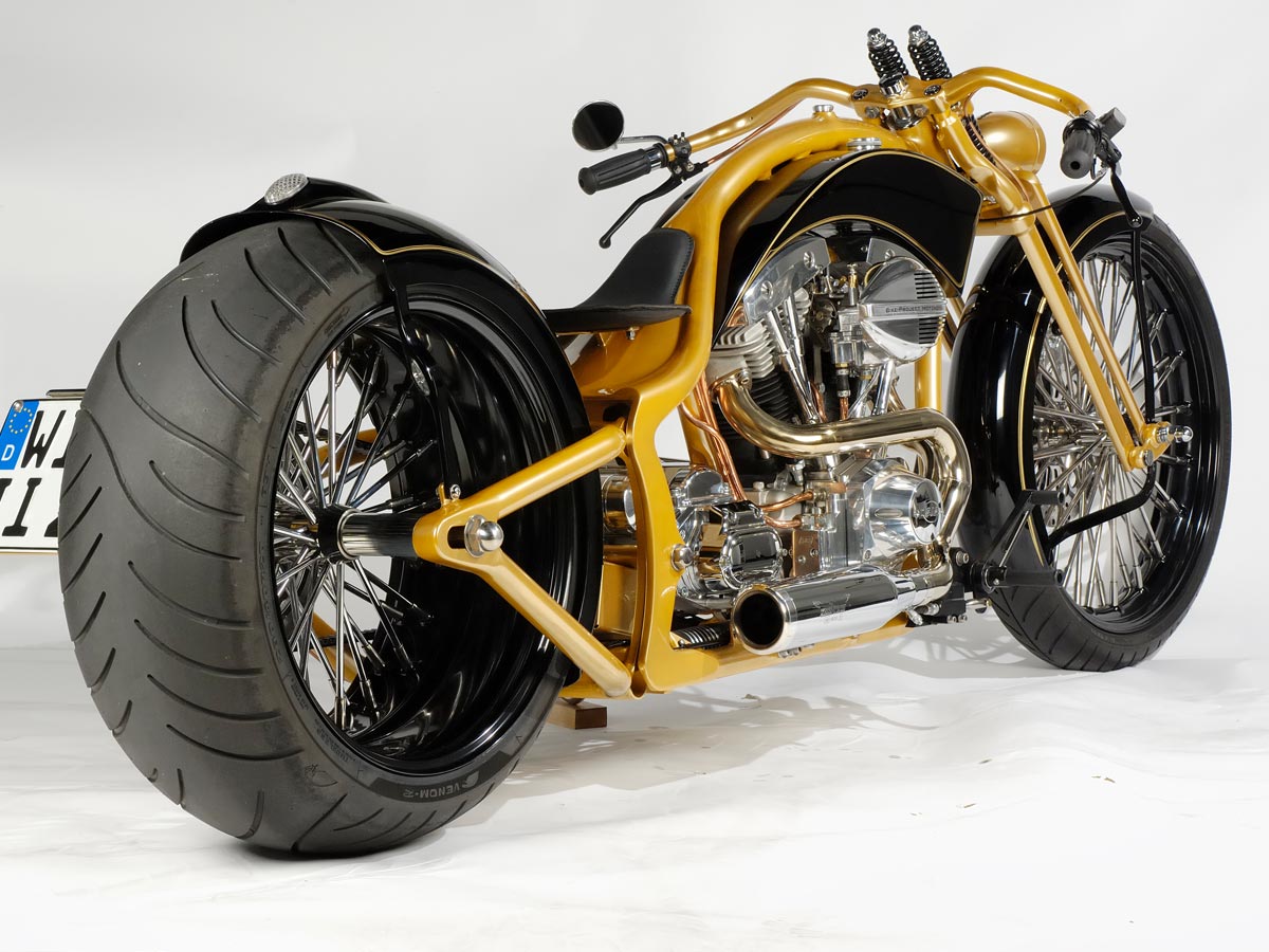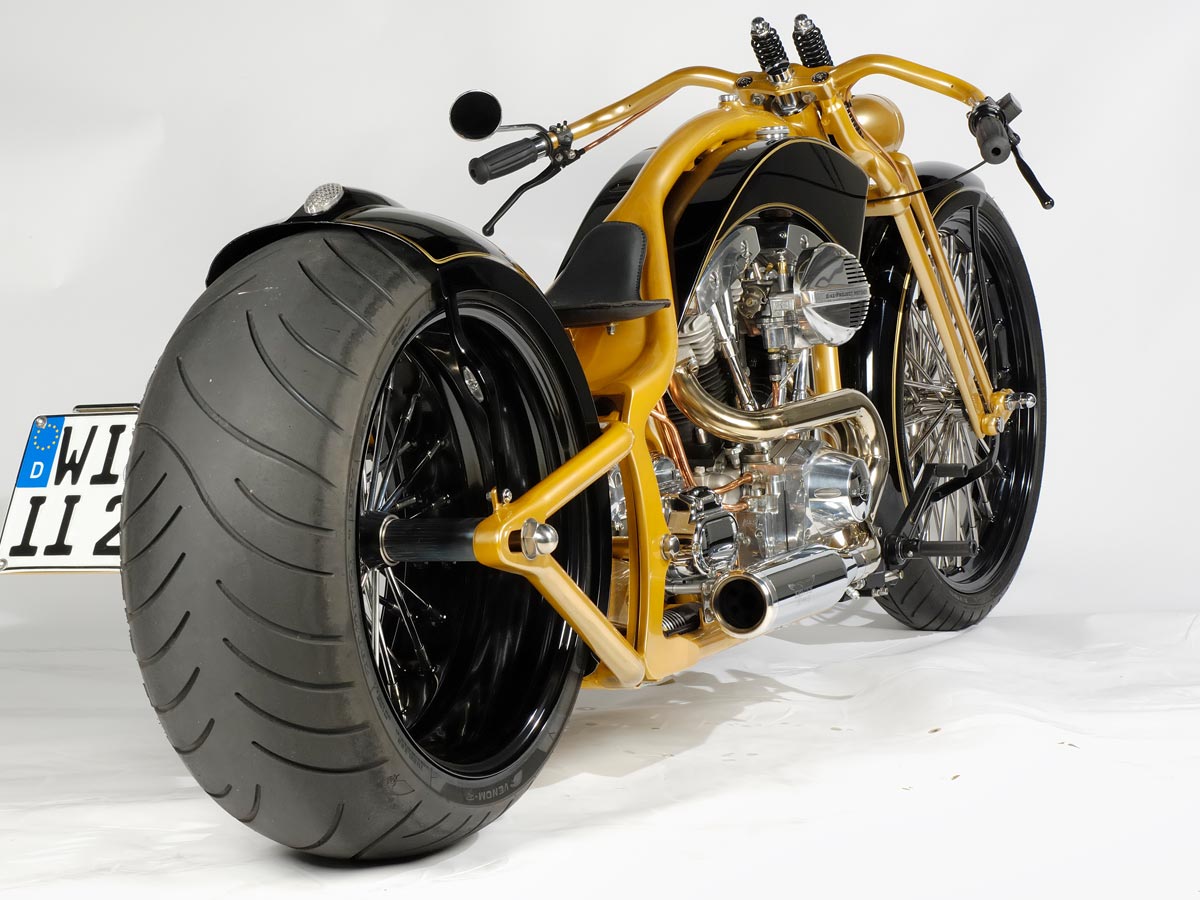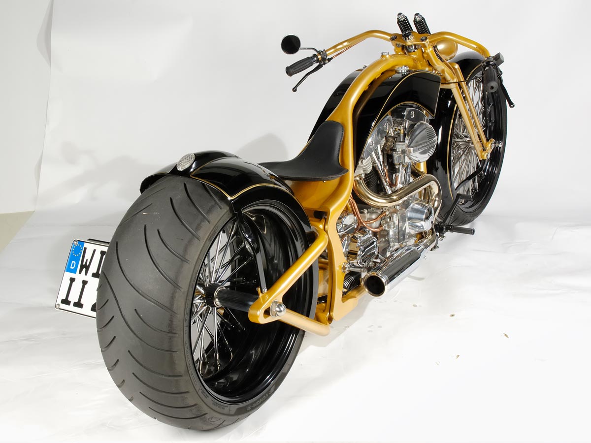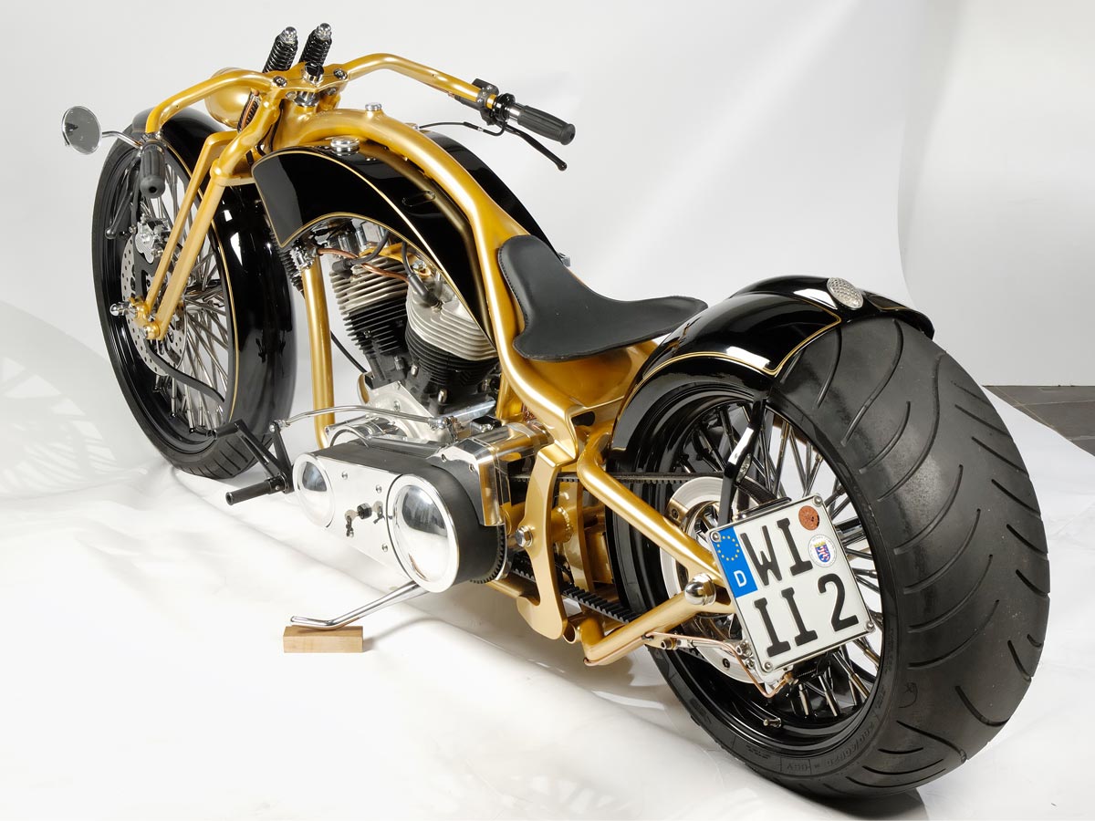Ein wirklich «Groß»artiger Auftrag! Für dieses Bike und die zu der Zeit neu am Markt erschienen Big Spoke Räder in 10″x 20 » und 3 1/2″ x 23″ hat Udo einen ganz besonderen Rahmen entwickelt. Extrem dicke Rahmenrohre und die Sitzhöhe wie bei einem drag Styl Rahmen aber ohne diesen unschönen Knick hinter dem Tank. Die Schwinge wurde wie bei einem standart Softailrahmen im Verlauf des Rahmens hergestellt. Und hier sehen Sie das Ergebnis.