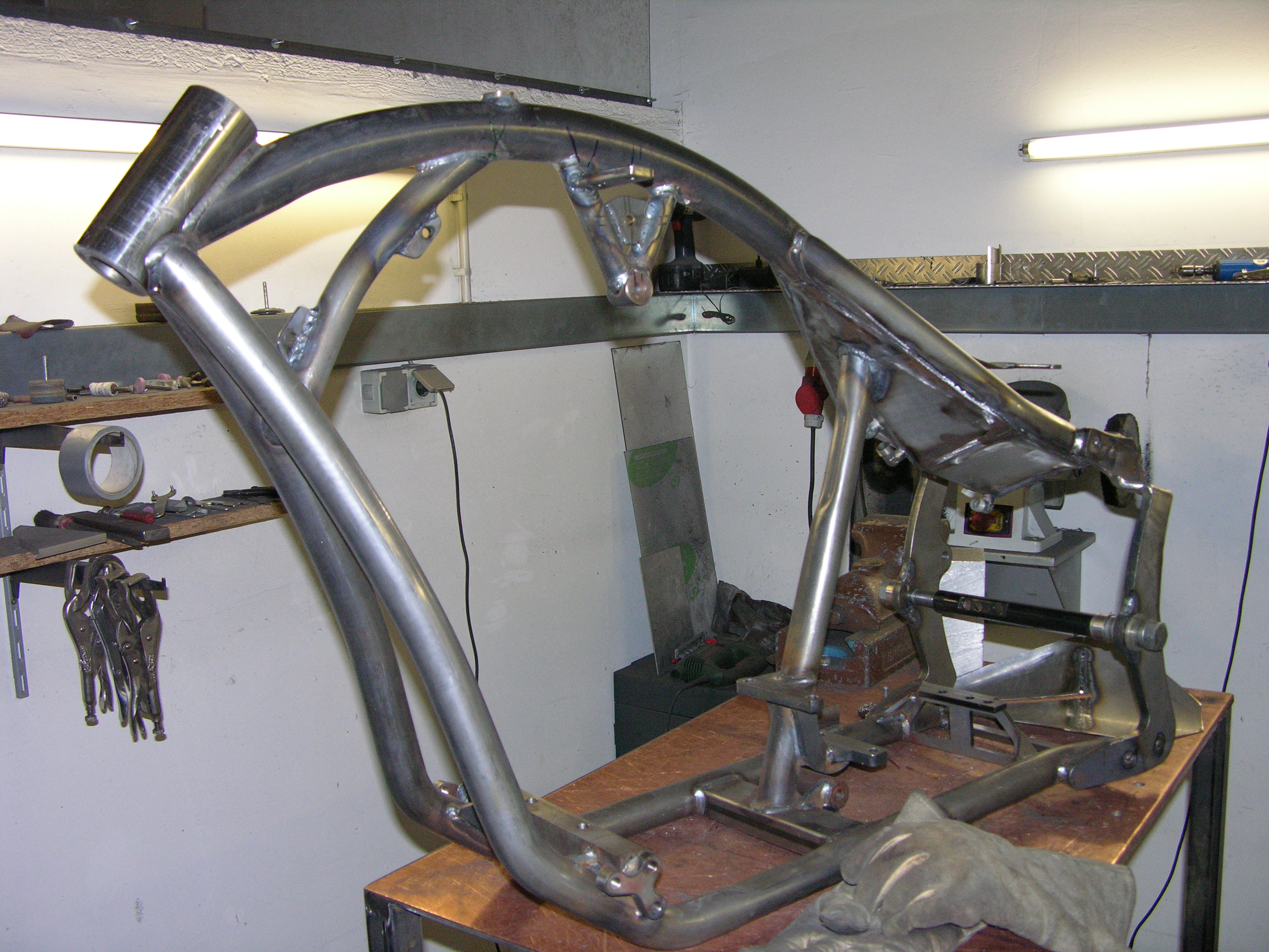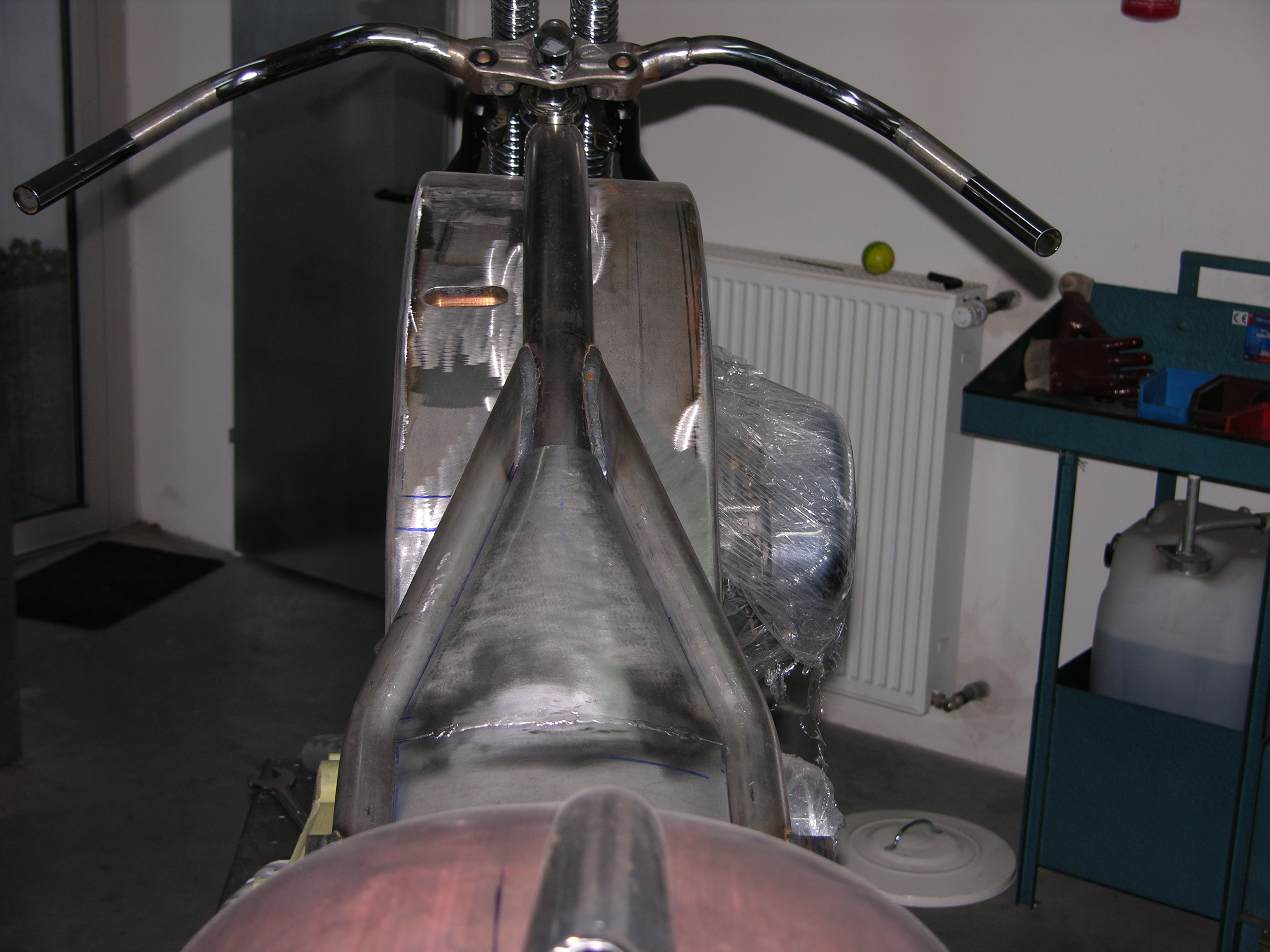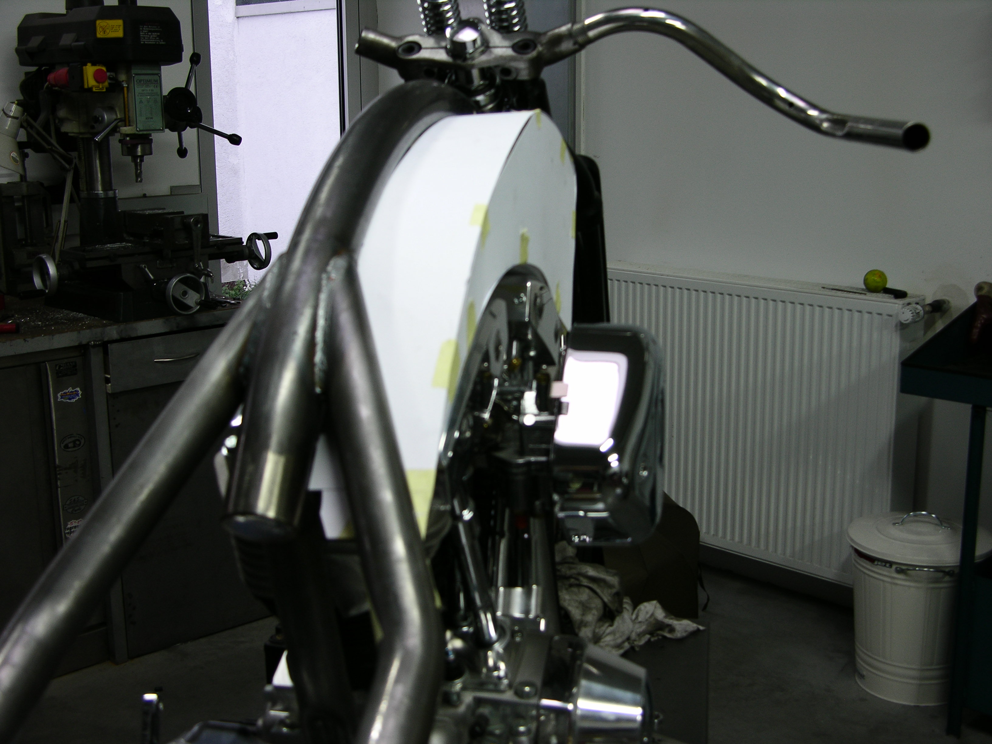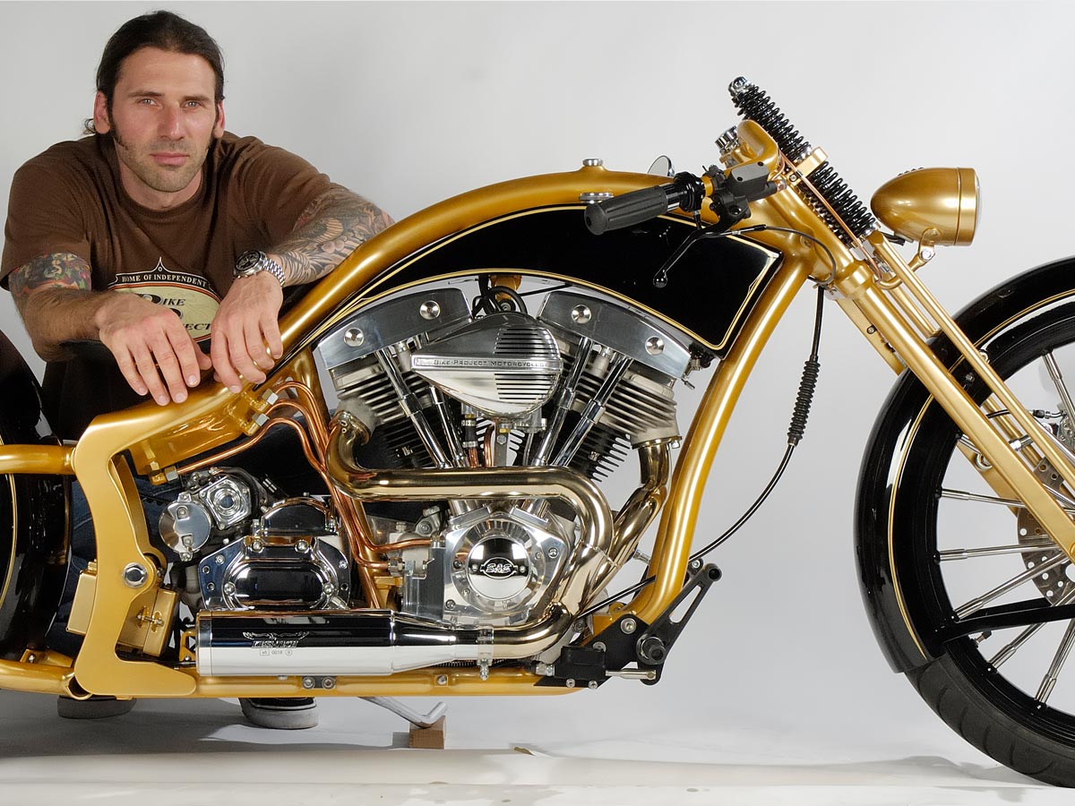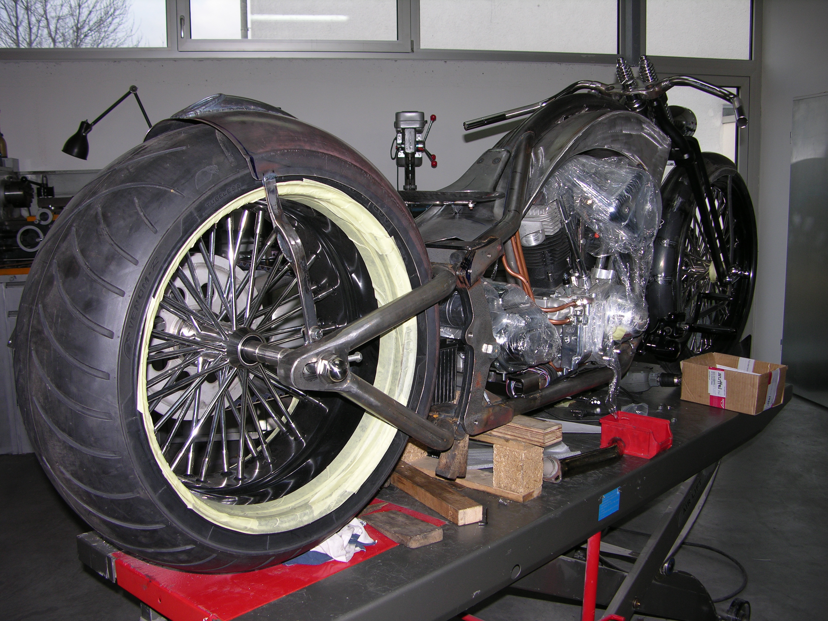 Ein wirklich «Groß»artiger Auftrag! Für dieses Bike und die zu der Zeit neu am Markt erschienen Big Spoke Räder in 10″x 20 » und 3 1/2″ x 23″ hat Udo einen ganz besonderen Rahmen entwickelt. Extrem dicke Rahmenrohre und die Sitzhöhe wie bei einem drag Styl Rahmen aber ohne diesen unschönen Knick hinter dem Tank. Die Schwinge wurde wie bei einem standart Softailrahmen im Verlauf des Rahmens hergestellt. Und hier sehen Sie das Ergebnis.