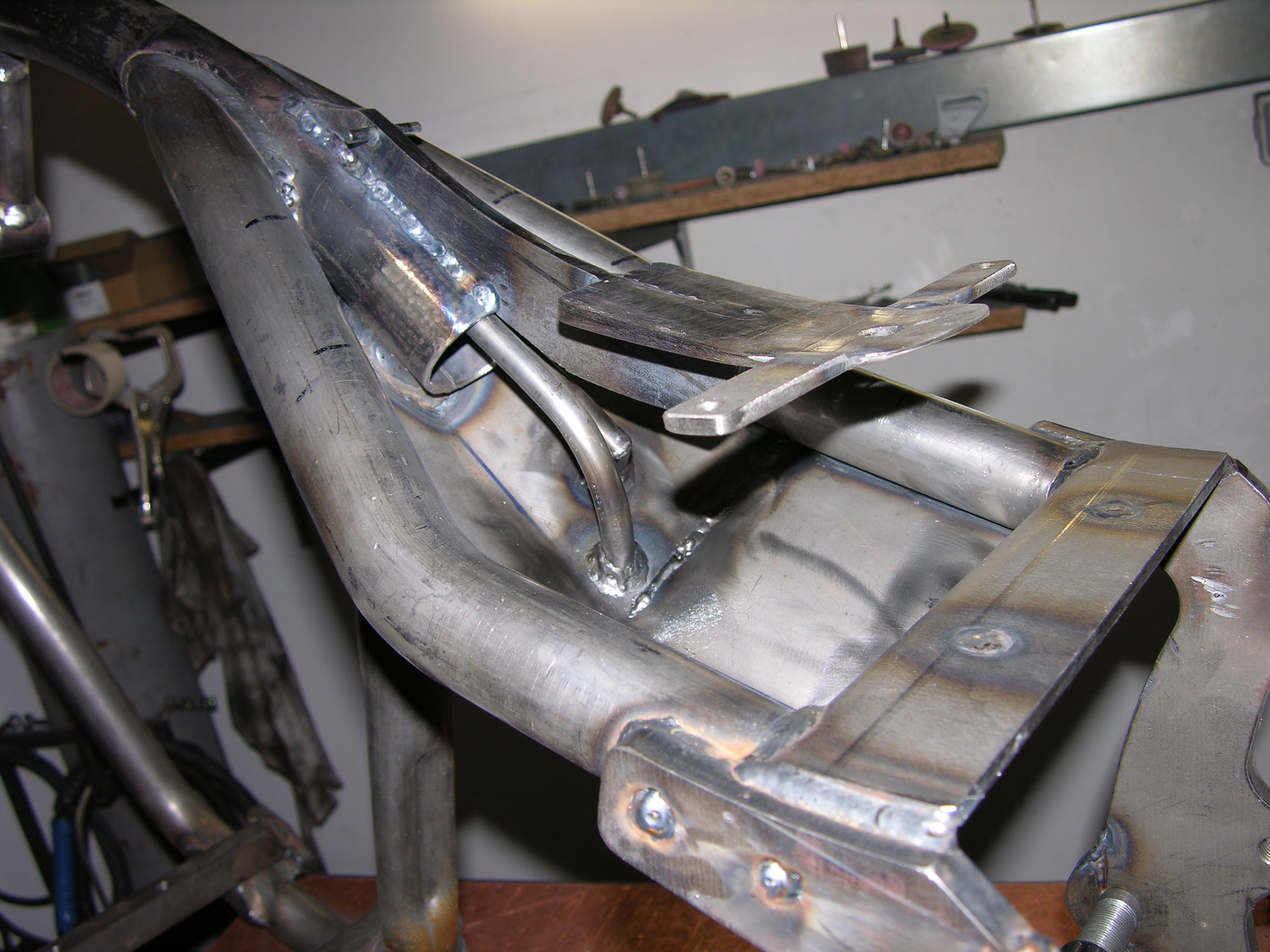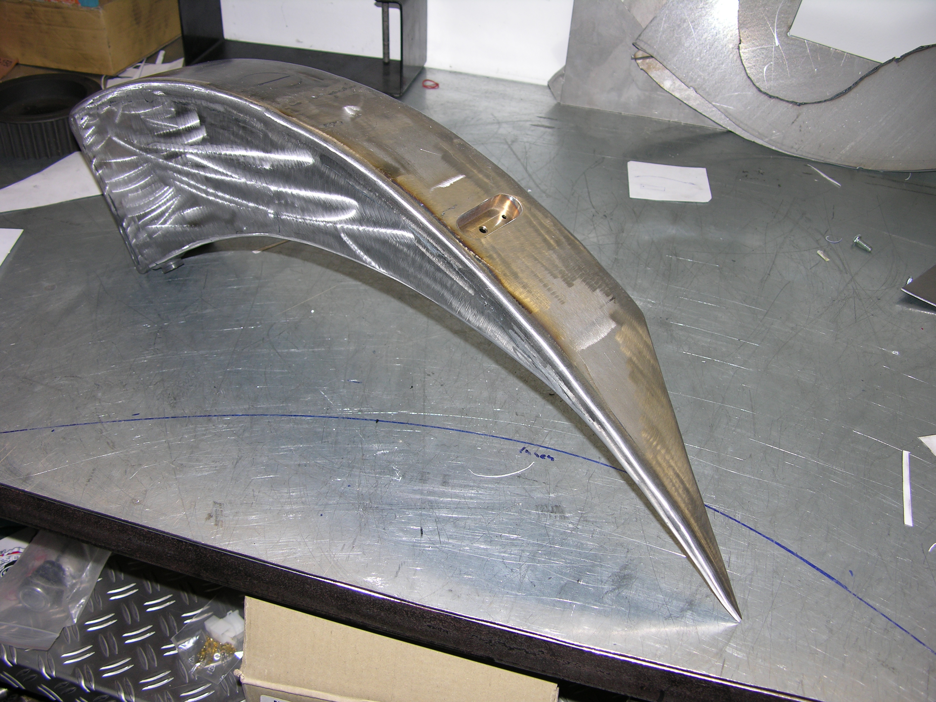 Alle Teile an diesem wunderschönen Fahrzeug wurden von Udo in Handarbeit hergestellt. Der Öltank ist im Rahmen integriert. Die linken Tankhälfte beherbergt im hinteren Teil des Tanks den Tacho, die Zündspule und ein Teil der Elektrik. Der vordere Fender wurde im Stiel der 40/50er Harleys hergestellt. jedoch hier mit geringem Abstand zum Reifen, da er mitschwingen gebaut wurde. Die Blinker sind im Lenker und in den Fenderstruts integriert. Alle Leitungen und Kabelführungen wurden starr hergestellt. Die 2 in 1 Auspuffanlage ist ebenfalls ein Produkt von B-P
